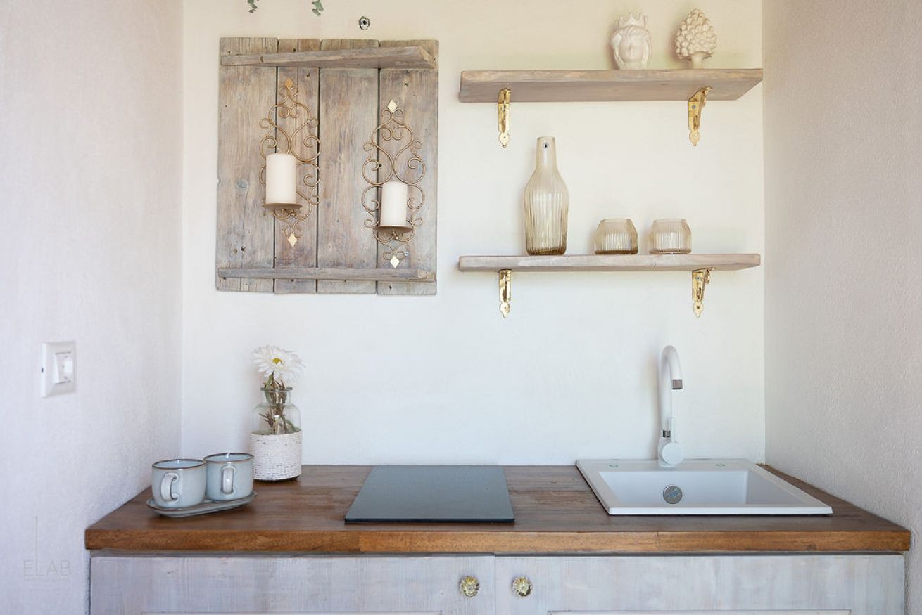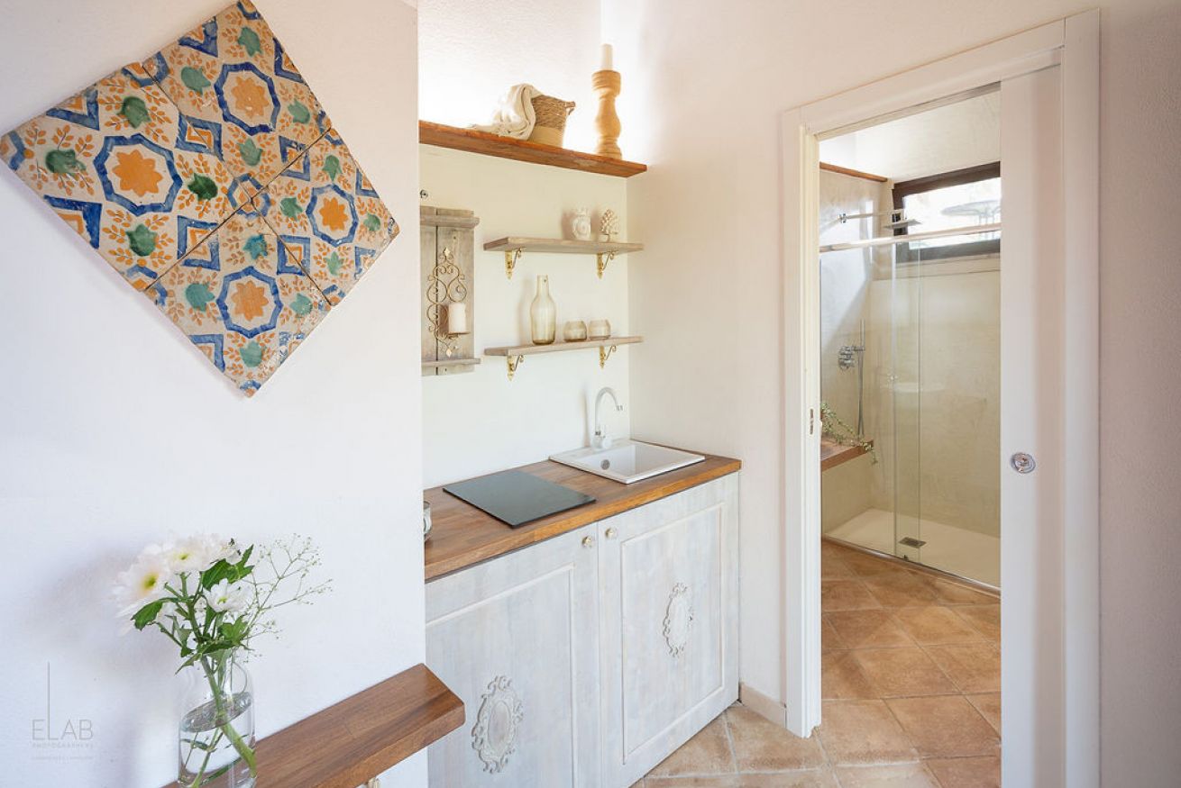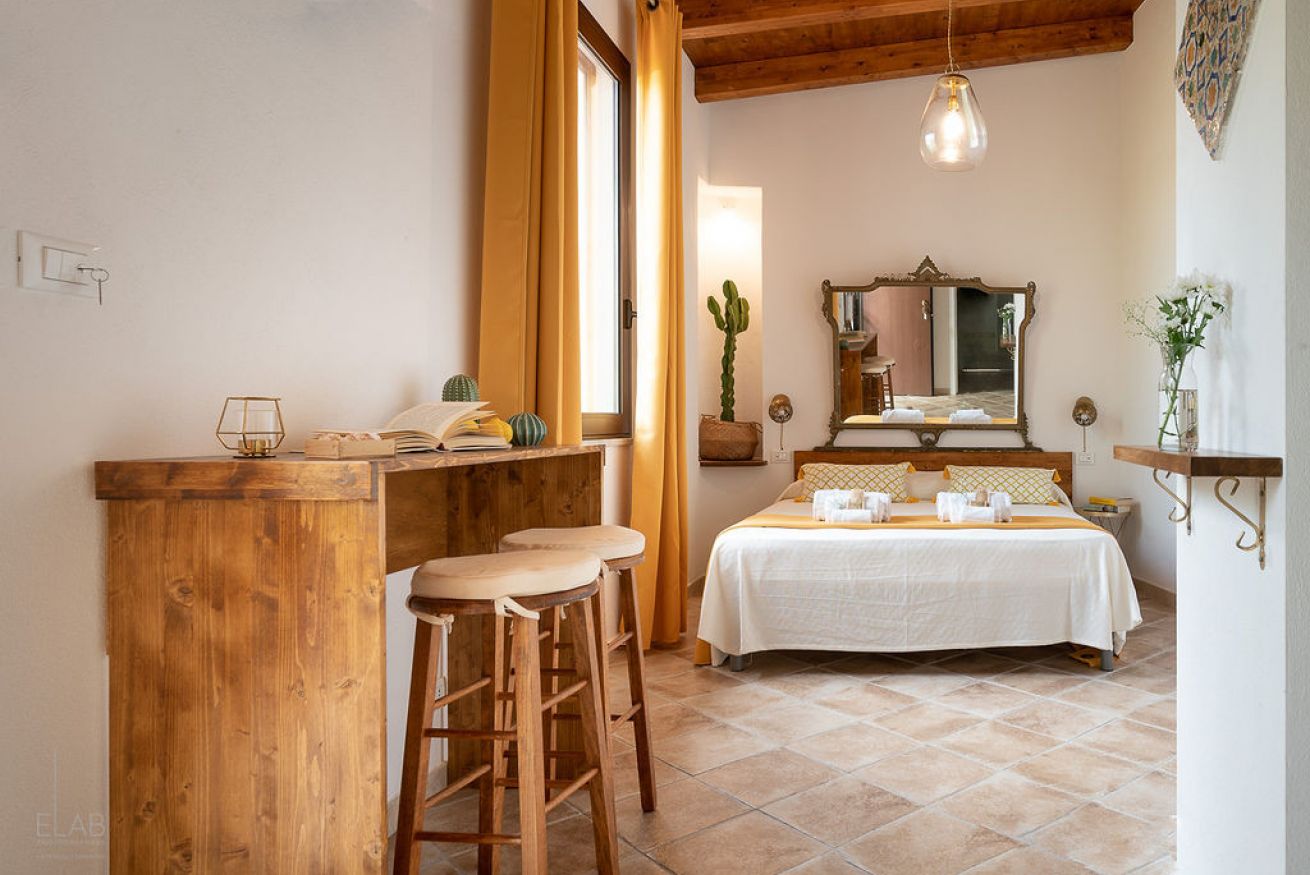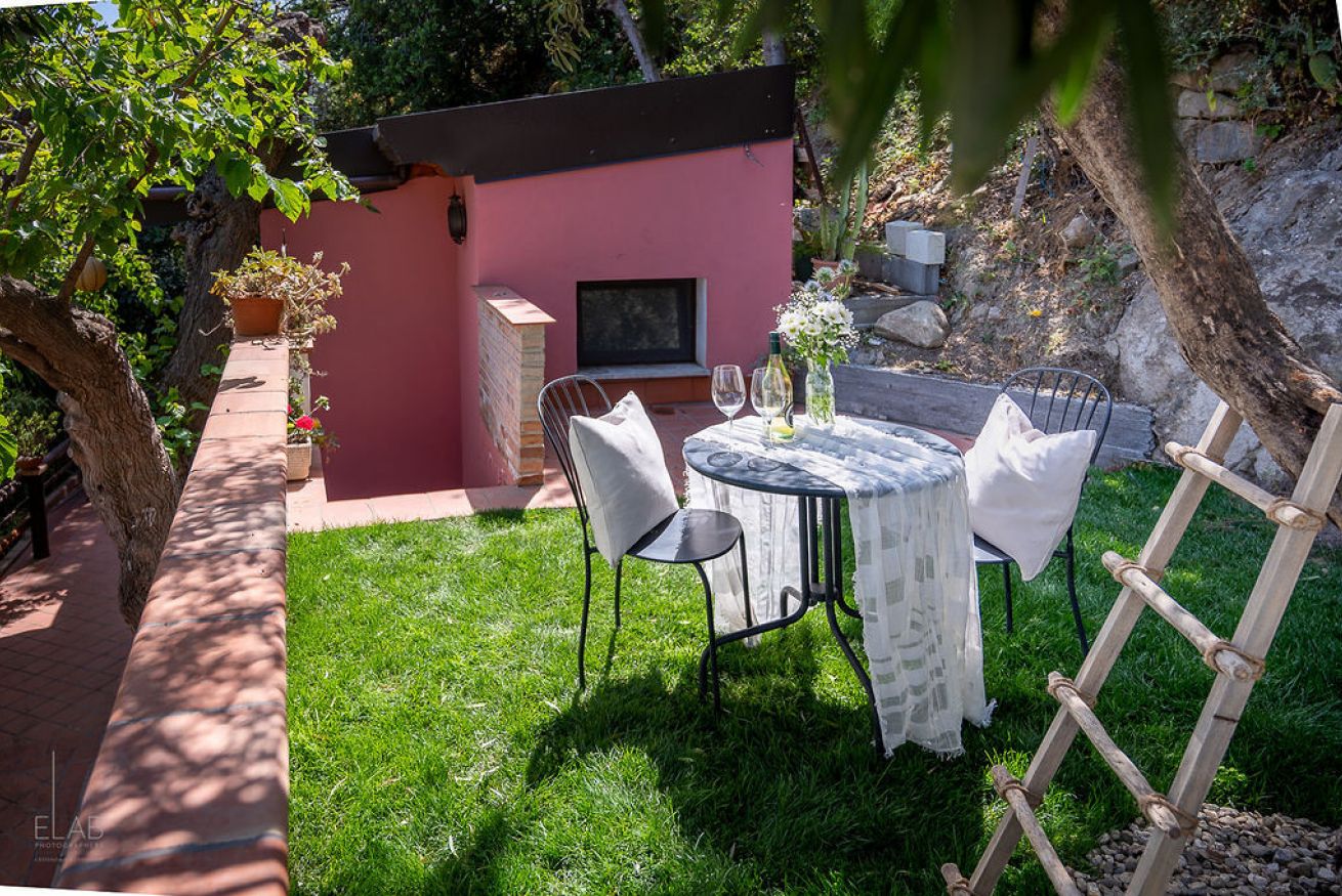 Monolocale con letto matrimoniale, angolo cottura e giardino privato.